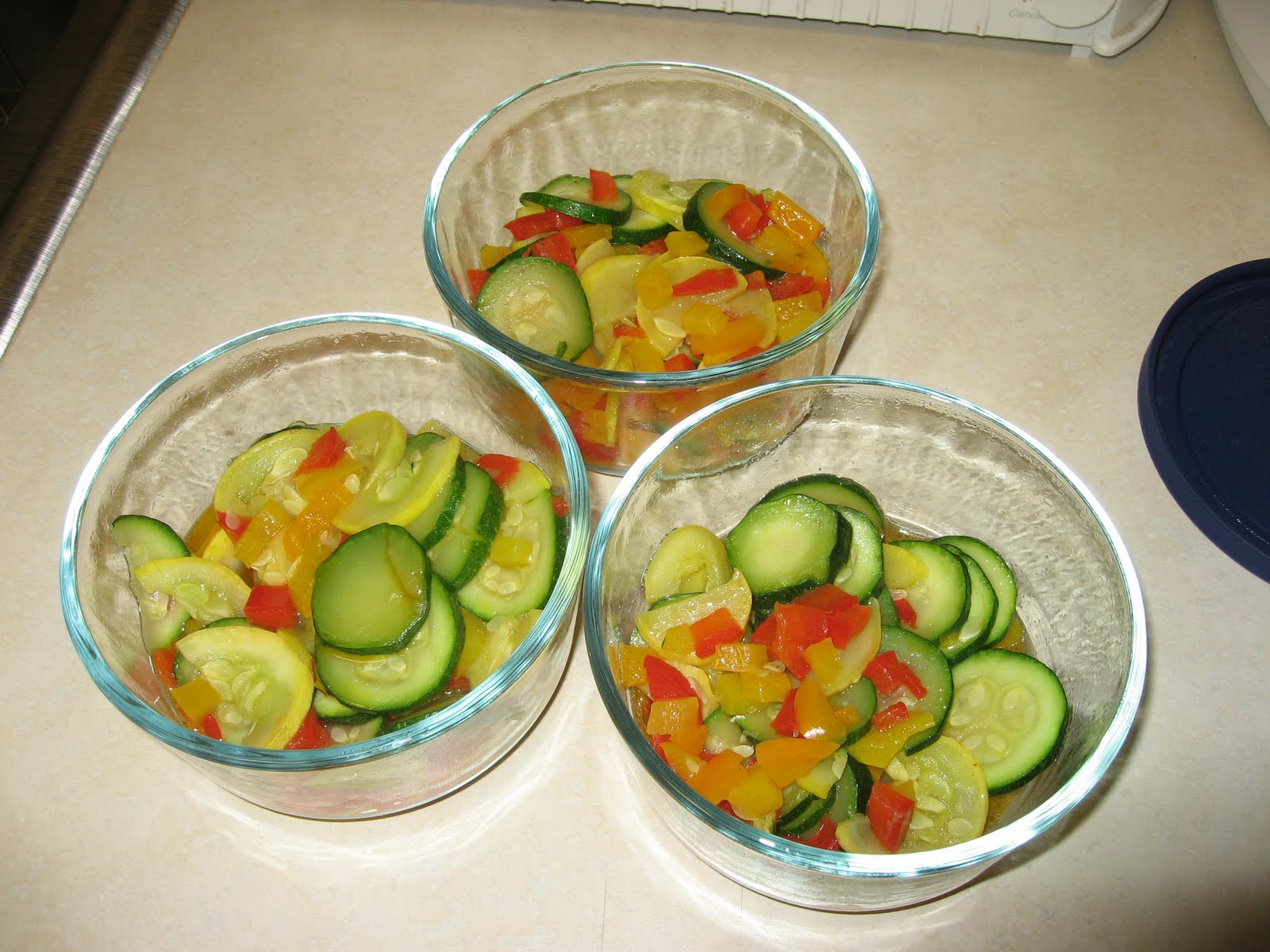 This is what I did with the zucchini, yellow squash, and three colors of peppers--quickly fried them up just a bit and put them into small containers. Had some on rice last night with a little Tamari sauce--yummy! I have to think of ways to have fresh foods for the entire month when I only order once. I froze up the rest of the chopped orange, yellow, and red peppers--so they are ready to use in a stir fry or whatever. Should have thought of this earlier--lost the rest of my mushrooms. But--better late than never, as they say, right? They should be good frozen, too. Handy to prepare ahead of time when I am not up to all that prep work. ;)