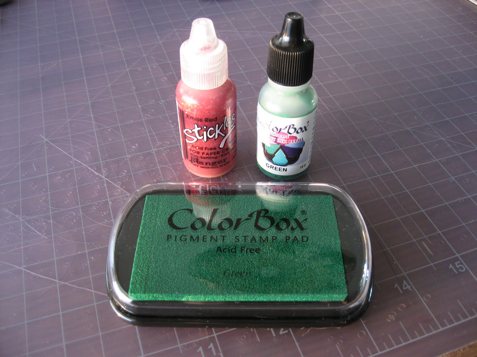 We found a nice green Colorbox pigment ink pad and refill--and a Christmas Red Stickles! Perfect!! :) Something went right, anyways.