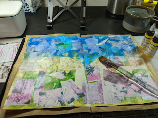 Putting white acrylic paint all over the sky and scraping some of it off...well, this watercolor paper I used to make these journals is so warpy and bumpy that I couldn't scrap decently with all the hills and valleys. Don't care for this spread at all. BUT I did get to use some new supplies and try some new techniques so that was fun. Process not results...I keep telling myself--LOL!
